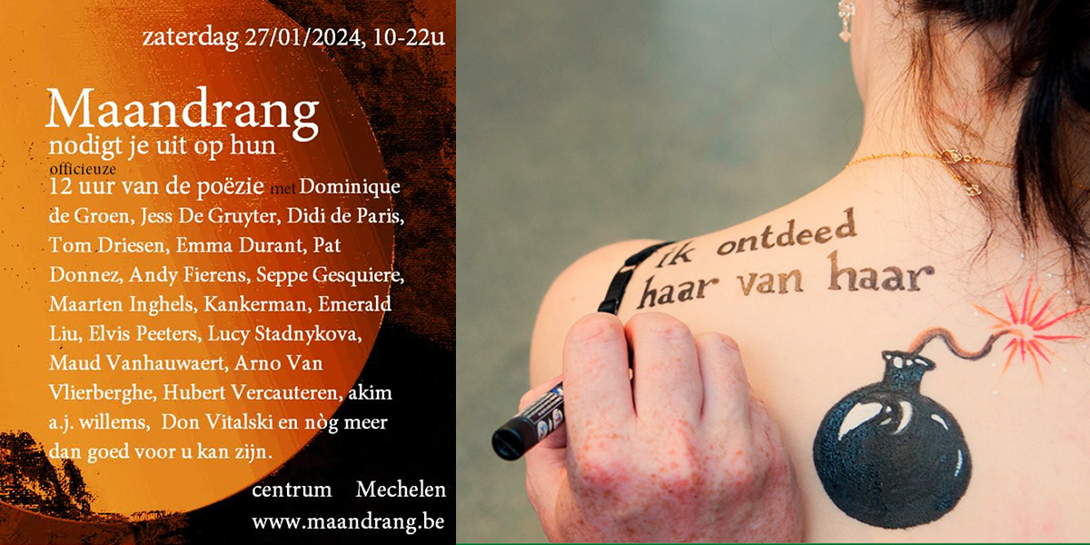 Op zaterdag 27 januari nodigt Maandrang je uit op de officieuze 12 Uur van de Poëzie met o.a. Dominique De Groen, Jess De Gruyter, Didi de Paris, Tom Driesen, Emma Durant, Pat Donnez, Andy Fierens, Seppe Gesquire, Maarten Inghels, Kankerman, Emerald Liu, Elvis Peeters, Lucy Stadnykova, Maud Vanhauwaert, Arno Van Vlierberghe, Hubert Vercauteren, akim a.j. willems, Don Vitalski en nog veel meer dan goed voor u kan zijn.